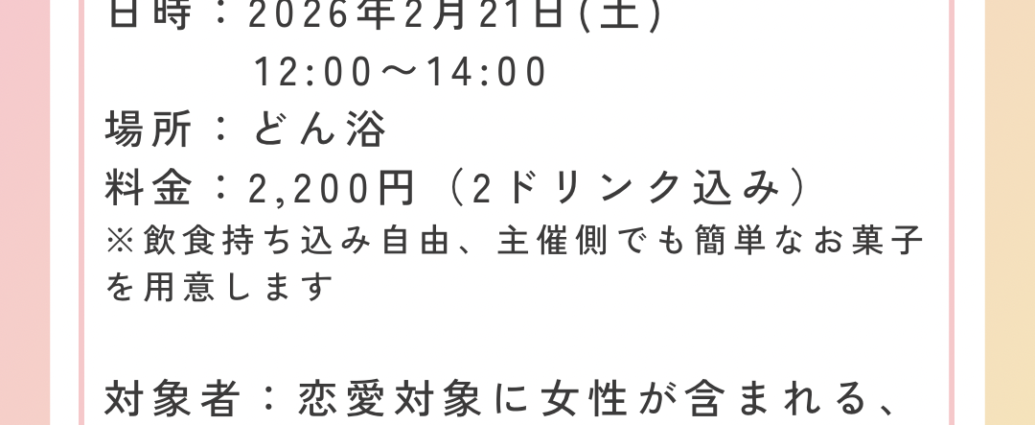 › ガチレズ!オフ会イベントカレンダー › 女性声優が好きなセクマイ女性オフ会女性声優が好きなセクマイ女性オフ会 近日開催! オフ会 2026/02/21(土)12:00 PM - 2:00 PM 東京都新宿区新宿2丁目7−3 203[地図] 日時:2026年2月21日(土) 12:00〜14:00 場所:足湯cafe&bar どん浴 料金:2,200円(2ドリンク込み) ※飲食持ち込み自由、主催側でも簡単なお菓子を用意します対象者:恋愛対象に女性が含まれる、広義の「女性」(性自認、出生時に割り当てられた性別など、何らかの仕方で「女性」の経験を持つ人)参加申込は下記フォームへの記入をお願いします。 参加申込フォーム